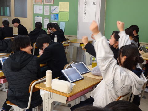 最後には、「長期的な視点で投資する大切さが分かった」「AI関連企業など将来性のある投資先を探した」「自分の好きな企業に投資するのも良いと感じた」など、生徒による感想発表の時間を設けていました。今回の体験を通じて、生徒たちは将来の資産形成に役立つ知識を身に付けただけでなく、将来働いてみたい企業や分野に目を向けるきっかけとなるなど、キャリア教育としても有意義な授業となりました。